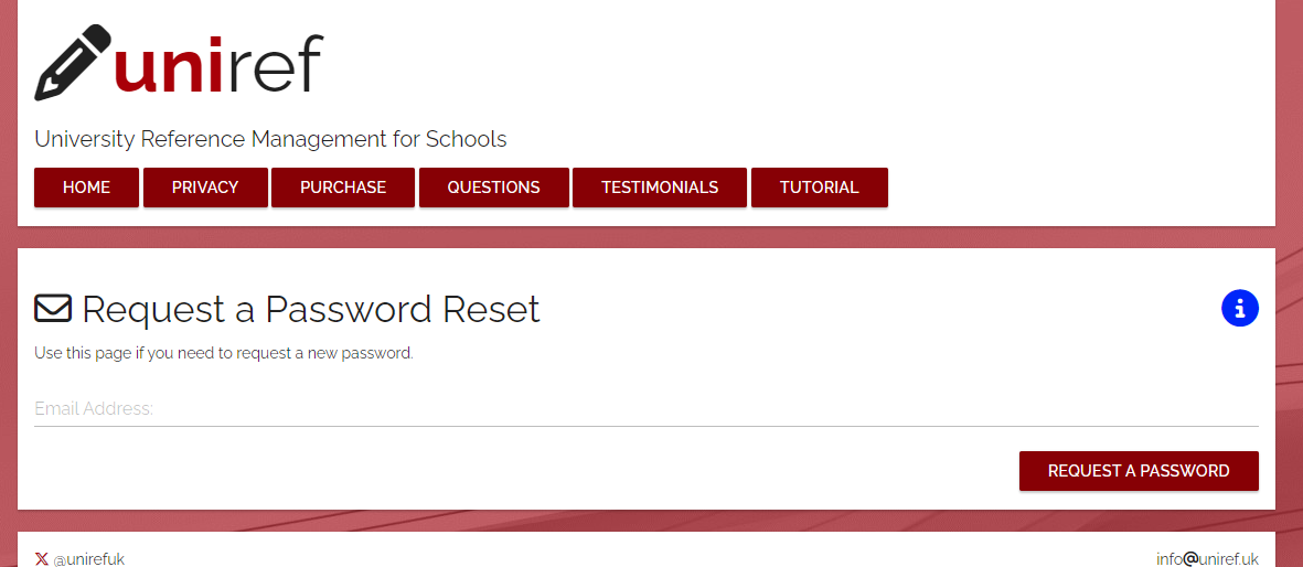 If your UCAS administrator has registered you, uniref will have a username recorded for you, but no password until you request one. Click on Password Reset, then enter your email address (usually a school email address) and click on Request a Password.